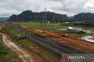 Suasana pengerjaan proyek pembangunan rel kereta api Makassar-Pare Pare di Kabupaten Maros, Sulawesi Selatan, Kamis (27/10/2022). Pembangunan rel kereta api sepanjang 144 kilometer tersebut merupakan salah satu proyek prioritas strategis Rencana Pembangunan Menengah Nasional (RPJMN) 2020-2024 dengan nilai investasi mencapai Rp8,25 triliun dan ditargetkan rampung pada 2024. ANTARA FOTO/Arnas Padda/aww.