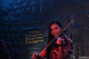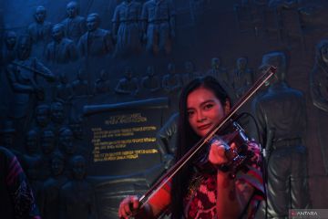 Seorang pemain biola memainkan lagu perjuangan dengan latar belakang ukiran pencetus kongres pemuda saat mengunjungi Museum Sumpah Pemuda di Jakarta, Jumat (28/10/2022). Museum tersebut mengadakan sejumlah kegiatan untuk memperingati Hari Sumpah Pemuda seperti upacara peringatan, lokakarya belajar bermain angklung, membatik serta lintas sejarah Sumpah Pemuda untuk membangun karakter generasi muda. ANTARA FOTO/Wahyu Putro A/hp.