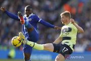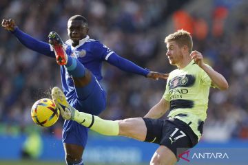 Pesepak bola Manchester City Kevin De Bruyne (kanan) berebut bola dengan Pesepak bola Leicester City Nampalys Mendy (kiri) pada pertandingan Liga Premier di Stadion King Power, Leicester, Inggris, Sabtu (29/10/2022). Manchester City menang atas tuan rumah Leicester City 1-0. ANTARA FOTO/Action Images/Jason Cairnduff/via Reuters/wsj.