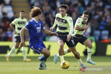 Pesepak bola Manchester City Jack Grealish (kedua kanan) berusaha melepaskan diri dari kawasan Pesepak bola Leicester City Wout Faes (kiri) pada pertandingan Liga Premier di Stadion King Power, Leicester, Inggris, Sabtu (29/10/2022). Manchester City menang atas tuan rumah Leicester City 1-0. ANTARA FOTO/Action Images/Jason Cairnduff/via Reuters/wsj.