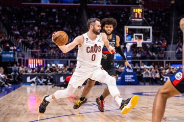 Pebasket Cleveland Cavaliers Kevin Love (kiri) membawa bola dan berusaha melewati penjagaa pebasket Detroit Pistons Isaiah Livers dalam laga lanjutan NBA, di Little Caesars Arena, Detroit, Michigan, Amerika Serikat, Jumat (4/11/2022). Cleveland Cavaliers berhasil mengalahkan Detroit Pistons 112 - 88. ANTARA FOTO/Reuters-Allison Farrand-USA TODAY Sports/hp.