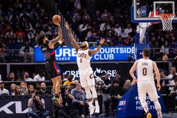 Pebasket Cleveland Cavaliers Evan Mobley (kanan) memasukkan bola untuk dapat 3 poin dan dihalangi pesbasket Detroit Pistons Isaiah Stewart (kiri) dalam laga lanjutan NBA, di Little Caesars Arena, Detroit, Michigan, Amerika Serikat, Jumat (4/11/2022). Cleveland Cavaliers berhasil mengalahkan Detroit Pistons 112 - 88. ANTARA FOTO/Reuters-Allison Farrand-USA TODAY Sports/hp.