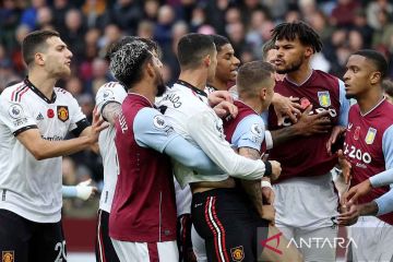 Pemain Manchester United Cristiano Ronaldo bentrok dengan pemain Aston Villa Tyrone Mings pada pertandingan lanjutan Liga Inggris di Villa Park, Birmingham, Inggris, Minggu (6/11/2022). Setan Merah kalah 1-3 di kandang Aston Villa. ANTARA FOTO/REUTERS/Carl Recine/rwa.