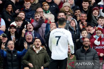 Pendukung Aston Villa bereaksi kepada pemain Manchester United Cristiano Ronaldo saat menghadapi Aston Villa pada pertandingan lanjutan Liga Inggris di Villa Park, Birmingham, Inggris, Minggu (6/11/2022). Setan Merah kalah 1-3 di kandang Aston Villa. ANTARA FOTO/REUTERS/Carl Recine/rwa.