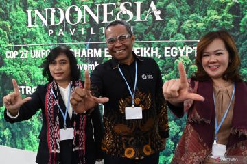 Wakil Ketua Umum KADIN Bidang Lingkungan Hidup dan Kehutanan Silverius Oscar Unggul (tengah) bersama Chief Sustainability Officer APP Sinar Mas Elim Sritaba (kanan), dan Peneliti BRIN Haruni Krisnawati (kiri) membentuk simbol "Lestari" dengan jari mereka usai menjadi pembicarta terkait kolaborasi multipihak untuk pencapaian Net Zero Emission pada Konferensi Perubahan Iklim COP27 UNFCCC di Paviliun Indonesia, Sharm El Sheikh, Mesir, Rabu (9/11/2022). Sinergi tersebut diharapkan dapat mendorong percepatan pencapaian target Net Zero Emission di tahun 2060 atau lebih cepat. ANTARA FOTO/Saptono/hp.