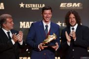 Robert Lewandowski dari FC Barcelona memberikan kata sambutan setelah menerima Sepatu Emas Eropa keduanya, di Antigua Fabrica Estrella Damm, Barcelona, Spanyol, Rabu (9/11/2022). ANTARA FOTO/Reuters- Albert Gea/hp.