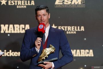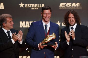 Robert Lewandowski dari FC Barcelona berpose untuk foto setelah menerima Sepatu Emas Eropa keduanya, di Antigua Fabrica Estrella Damm, Barcelona, Spanyol, Rabu (9/11/2022). ANTARA FOTO/Reuters- Albert Gea/hp.