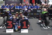 Pebalap Pata Yamaha With Brixx WorldSBK Toprak Razgatlioglu (kanan) dan Andrea Locatelli berpose usai menyelesaikan Superpole World Superbike 2022 di Pertamina Mandalika International Street Circuit, KEK Mandalika, Desa Kuta, Kecamatan Pujut, Praya, Lombok Tengah, NTB, Sabtu (12/11/2022). Pebalap Turki tersebut akan start terdepan pada Race 1 WSBK Mandalika 2022. ANTARA FOTO/Puspa Perwitasari/hp.