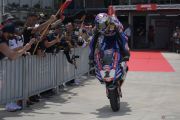 Pebalap Pata Yamaha With Brixx WorldSBK Toprak Razgatlioglu melakukan "stoopie" usai menyelesaikan Superpole World Superbike 2022 di Pertamina Mandalika International Street Circuit, KEK Mandalika, Desa Kuta, Kecamatan Pujut, Praya, Lombok Tengah, NTB, Sabtu (12/11/2022). Pebalap Turki tersebut akan start terdepan pada Race 1 WSBK Mandalika 2022. ANTARA FOTO/Puspa Perwitasari/hp.