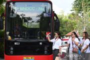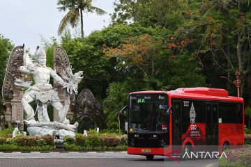 Bus listrik yang menjadi transportasi angkutan pengumpan (shuttle) melintas di kawasan Nusa Dua, Badung, Bali, Sabtu (12/11/2022). Puluhan bus bertenaga listrik difungsikan untuk mendukung kelancaran mobilitas bagi para delegasi pada rangkaian kegiatan KTT G20 di Bali. ANTARA FOTO/Media Center G20 Indonesia/Fikri Yusuf/aww.
