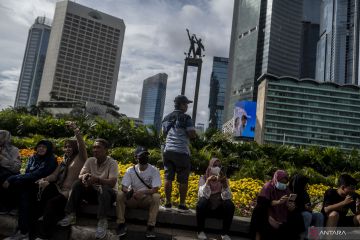 Sejumlah warga duduk saat Hari Bebas Kendaraan Bermotor (HBKB) di kawasan Bundaran HI, Jakarta, Minggu (20/11/2022). Kementerian Kesehatan menyebutkan bahwa peningakatan kasus konfrimasi COVID-19 disebabkan oleh munculnya subvarian baru dan menghimbau masyarakat untuk memperketat protokol kesehatannya serta vaksin boster. ANTARA FOTO/Aprillio Akbar/hp.