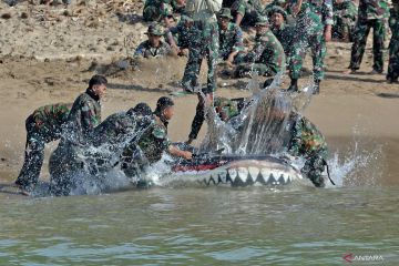 Prajurit Korps Marinir membalikan perahu karet yang digunakan untuk berlindung dari bahaya udara di Pantai Tamban, Tambakrejo, Sumbermanjing Wetan, Malang, Jawa Timur, Minggu (20/11/2022). Kegiatan tersebut dalam rangka Latihan Pemantapan Batalyon Infanteri (Lattap Yonif) Marinir Dengan Perkuatan Kesenjataan (DPK) tahun 2022. ANTARA FOTO/Kopda Mar Moch Ainul Yakin/foc.