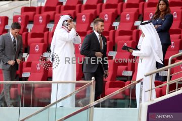 Pesepak bola David Beckham terlihat di dalam stadion sebelum dimulainya pertandingan antara Inggris melawan Iran dalam laga Group B Piala Dunia 2022, di Stadion Khalifa International, Doha, Qatar, Senin (21/11/2022). ANTARA FOTO/Reuters-Carl Recine/hp.