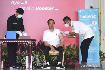 Presiden Joko Widodo (tengah) menerima suntikan vaksin COVID-19 IndoVac dosis "booster" kedua di halaman Istana Kepresidenan Bogor, Jawa Barat, Kamis (24/11/2022). Presiden Jokowi mengajak seluruh masyarakat terutama tenaga kesehatan dan lansia untuk melakukan vaksinasi COVID-19 secara lengkap dan ditambah dosis penguat (booster) untuk meningkatkan imunitas sehingga dapat memutus penularan COVID-19. ANTARA FOTO/Biro Pers Setpres/Lukas/Handout/wsj.