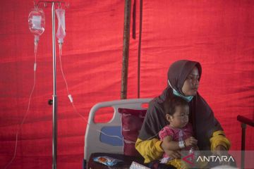 Seorang ibu menemani anaknya yang menjadi pasien korban gempa bumi Cianjur di RSUD Sayang, Kabupaten Cianjur, Jawa Barat, Kamis (24/11/2022). Pasien korban gempa bumi yang dirawat di RSUD Sayang Cianjur saat ini tersisa 24 orang dari sebelumnya sebanyak 741 pasien. ANTARA FOTO/Wahyu Putro A/wsj.