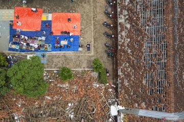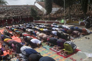 Warga melaksanakan shalat Jumat di antara reruntuhan bangunan pascagempa bumi Cianjur di Garogol Kidul, Cibulakan, Cugenang, Kabupaten Cianjur, Jawa Barat, Jumat (25/11/2022). ANTARA FOTO/Wahyu Putro A/hp.