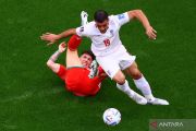 Pesepak bola Wales Harry Wilson terjatuh saat berebut bola dengan pemain Iran Majid Hosseini saat laga Grup B Piala Dunia 2022 di Ahmad Bin Ali Stadium, Al Rayyan, Qatar, Jumat (25/11/2022). ANTARA FOTO/REUTERS/Fabrizio Bensch/foc.