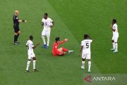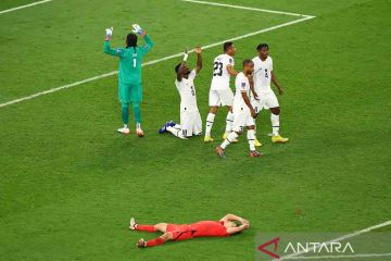 Pemain Ghana berselebrasi usai menundukkan Korea Selatan pada pertandingan Grup H Piala Dunia 2022 di Education City Stadium, Al Rayyan, Qatar, Senin (28/11/2022). Ghana menang 3-2 atas Korea Selatan. ANTARA FOTO/REUTERS/Matthew Childs/rwa.