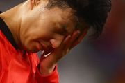 Pemain Korea Selatan Son Heung-min mengusap wajahnya usai kalah dari Ghana pada pertandingan Grup H Piala Dunia 2022 di Education City Stadium, Al Rayyan, Qatar, Senin (28/11/2022). Ghana menang 3-2 atas Korea Selatan. ANTARA FOTO/REUTERS/Kai Pfaffenbach/rwa.