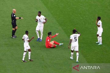 Pemain Korea Selatan Son Heung-min memprotes pelanggaran saat menghadapi Ghana pada pertandingan Grup H Piala Dunia 2022 di Education City Stadium, Al Rayyan, Qatar, Senin (28/11/2022). Ghana menang 3-2 atas Korea Selatan. ANTARA FOTO/REUTERS/Matthew Childs/rwa.