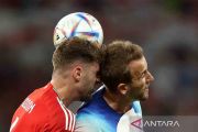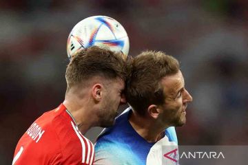 Pemain Wales Joe Rodon berebut bola dengan pemain Inggris Harry Kane pada laga Grup B Piala Dunia 2022 di Ahmad Bin Ali Stadium, Al Rayyan, Qatar, Selasa (29/11/2022). The Three Lions lolos ke babak 16 besar setelah melibas Wales 3-0. ANTARA FOTO/REUTERS/Carl Recine/rwa.
