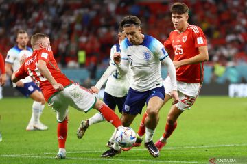 Pemain Wales Joe Morrell dan Rubin Colwill berebut bola dengan pemain Inggris Jack Grealish pada laga Grup B Piala Dunia 2022 di Ahmad Bin Ali Stadium, Al Rayyan, Qatar, Selasa (29/11/2022). The Three Lions lolos ke babak 16 besar setelah melibas Wales 3-0. ANTARA FOTO/REUTERS/Hannah Mckay/rwa.