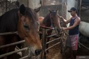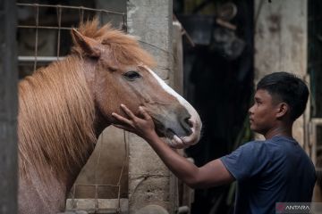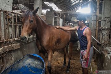 Pekerja merawat kuda yang dipersiapkan untuk menarik kereta kencana pada acara kirab pernikahan putra bungsu Presiden Jokowi, Kaesang Pangerap dengan Erina Gundono di Jajar, Solo, Jawa Tengah, Senin (5/12/2022). Panitia menyiapkan 28 kuda dan 12 kereta kencana untuk kirab pernikahan Kaesang Pangarep dengan Erina Gundono dari Loji Gandrung menuju lokasi acara di Pura Mangkunegaran. ANTARA FOTO/Mohammad Ayudha/hp.
