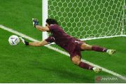 Penjaga gawang Maroko Yassine Bounou berhasil menepis tendangan pesepak bola Spanyol Sergio Busquets dari titik penalti dalam laga babak 16 besar Piala Dunia 2022, di Stadion Education City, Al Rayyan, Qatar, Selasa (6/12/2022), Maroko berhasil melaju ke perempat final setelah kalahkan Spanyol 3-0 lewat adu penalti. ANTARA FOTO/Reuters-Lee Smith/hp.