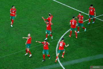 Para pemain Maroko melakukan selebrasi setelah memastikan kemenangan mereka atas Spanyol dalam lewat adu penalti dalam laga babak 16 besar Piala Dunia 2022, di Stadion Education City, Al Rayyan, Qatar, Selasa (6/12/2022), Maroko berhasil melaju ke perempat final setelah kalahkan Spanyol 3-0 lewat adu penalti. ANTARA FOTO/Reuters-Matthew Childs/hp.Fabrizio Bensch