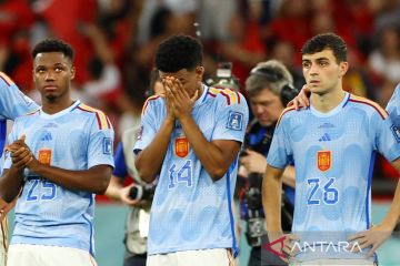 Pesepak bola Spanyol Alejandro Balde terlihat kecewa setelah timnya dikalahkan Maroko dalam babak 16 besar Piala Dunia 2022, di Stadion Education City, Al Rayyan, Qatar, Selasa (6/12/2022), Maroko berhasil melaju ke perempat final setelah kalahkan Spanyol 3-0 lewat adu penalti. ANTARA FOTO/Reuters-.Bernadett Szabo/hp
