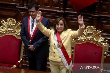 Presiden sementara Peru Dina Boluarte, yang dipanggil oleh Kongres untuk menjabat setelah badan legislatif menyetujui pencopotan Presiden Pedro Castillo dalam sidang pemakzulan, usai dilantik di Lima Peru, Rabu (7/12/2022). Dina Boluarter menggantikan Pedro Castillo dan menjadi pemimpin wanita pertama dalam sejarah republik tersebut. ANTARA FOTO/REUTERS/Sebastian Castaneda/rwa.