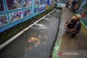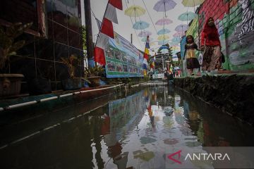Warga melintas di samping selokan di Kampung Pos Muara, Bojonggede, Kabupaten Bogor, Jawa Barat, Kamis (8/12/2022). Masyarakat sekitar secara swadaya mengubah kampung yang sebelumnya kumuh serta selokan yang dipenuhi sampah, menjadi kampung ramah lingkungan dengan menjadikan selokan sebagai tempat budidaya ikan. ANTARA FOTO/Yulius Satria Wijaya/rwa.