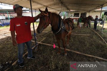Pemilik kuda menunjukan kudanya saat tiba di Polresta Solo, Jawa Tengah, Sabtu (10/11/2022). Sebanyak 28 ekor kuda dan 12 kereta kuda diinapkan di Polresta Solo untuk dipersiapkan kirab ngunduh mantu pernikahan putra bungsu Presiden Joko Widodo, Kaesang Pangarep dengan Erina Gudono. ANTARA FOTO/Aloysius Jarot Nugroho/rwa.