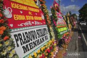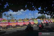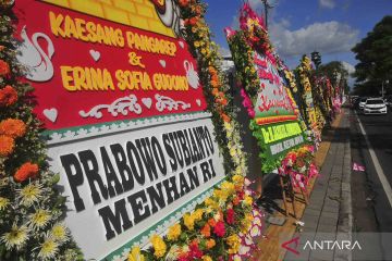 Pengendara motor melintas di dekat sejumlah karangan bunga ucapan selamat atas pernikahan putra Presiden Joko Widodo, Kaesang Pangarep dengan Erina Gudono di kawasan Pura Mangkunegaran, Solo, Jawa Tengah, Sabtu (10/12/2022). Kiriman karangan bunga tersebut datang dari sejumlah pejabat tinggi negara hingga pejabat daerah. ANTARA FOTO/Yusuf Nugroho/wsj.