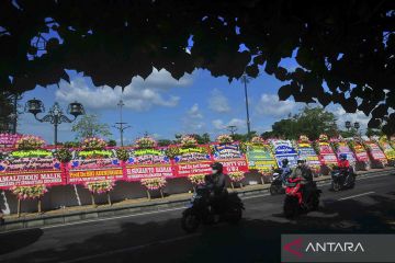 Pengendara mobil melintas di dekat sejumlah karangan bunga ucapan selamat atas pernikahan putra Presiden Joko Widodo, Kaesang Pangarep dengan Erina Gudono di kawasan Pura Mangkunegaran, Solo, Jawa Tengah, Sabtu (10/12/2022). Kiriman karangan bunga tersebut datang dari sejumlah pejabat tinggi negara hingga pejabat daerah. ANTARA FOTO/Yusuf Nugroho/wsj.
