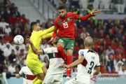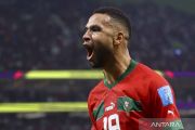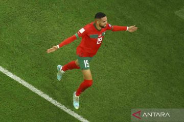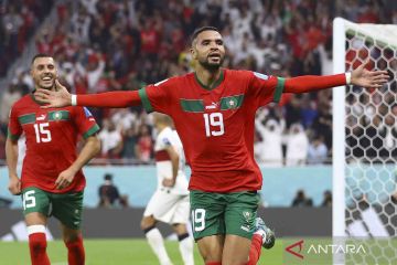 Pemain timnas Maroko Youssef En-Nesyri (19) berselebrasi usai mencetak gol ke gawang Portugal pada pertandingan babak perempat final Piala Dunia Qatar 2022 di Stadion Al Thumama, Doha, Qatar, Sabtu (10/12/2022). Skor sementara hingga menit ke-60, Maroko memimpin 1-0 atas Portugal. ANTARA FOTO/REUTERS/Fabrizio Bensch/wsj.