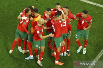 Pemain timnas Maroko Youssef En-Nesyri (19) berselebrasi bersama rekan setimnya usai mencetak gol ke gawang Portugal pada pertandingan babak perempat final Piala Dunia Qatar 2022 di Stadion Al Thumama, Doha, Qatar, Sabtu (10/12/2022). Skor sementara hingga menit ke-60, Maroko memimpin 1-0 atas Portugal. ANTARA FOTO/REUTERS/Fabrizio Bensch/wsj.