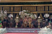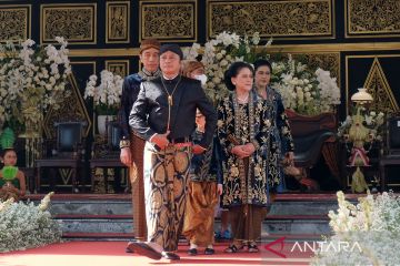 Presiden Joko Widodo (kiri) didampingi Ibu Negara Iriana Joko Widodo (kedua kanan) mengikuti prosesi pasrah penampi boyong pengantin saat acara ngunduh mantu pernikahan putra bungsunya Kaesang Pangarep dengan Erina Gudono di Loji Gandrung Solo, Jawa Tengah, Minggu (11/12/2022). Acara ngunduh mantu pernikahan putra presiden tersebut juga diisi dengan kirab budaya dan pesta rakyat. ANTARA FOTO/Maulana Surya/pras.