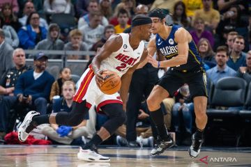Pebasket Miami Heat Jimmy Butler (kanan) melemparkan bola ke jaring lawan dan di hadang pebasket Indiana Pacers Andrew Nembhard (kiri) dalam laga lanjutan NBA, di Gainbridge Fieldhouse, Indianapolis, Indiana, Amerika Serikat, Senin (12/12/2022). Miami Heat berhasil mengalahkan Indiana Pacers 87-82. ANTARA FOTO/Reuters-Trevor Ruszkowski-USA TODAY Sports/hp.