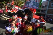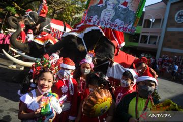 Pelajar menyambut lima gajah dengan kostum bertema Natal yang mengunjungi sekolah mereka untuk membagikan hadiah di Ayutthaya, Thailand, Jumat (23/12/2022). ANTARAFOTO/REUTERS/Chalinee Thirasupa/foc.
