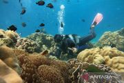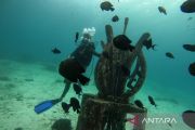 Wisatawan menyelam untuk menikmati keindahan bawah laut Pulau Rubiah, kawasan Desa Iboih, Kota Sabang, Aceh, Selasa (27/12/2022). Diving Gampong (desa) Iboih merupakan destinasi unggulan yang menarik wisatawan domestik dan mancanegara, dan telah meraih juara dalam Anugerah Pesona Indonesia (API) Award 2022 kategori Wisata air. ANTARA FOTO/Khalis Surry/aww.