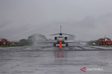Suasana prosesi Water Salute saat pesawat jet Falcon 7x mendarat di Skadron Udara 17, Lanud Halim Perdanakusuma, Jakarta, Rabu (28/12/2022). Kementerian Pertahanan menyerahkan dua pesawat jet yakni Falcon 7X dan Falcon 8X kepada TNI Angkatan Udara yang nantinya akan dioperasikan oleh Skadron Udara 17 VVIP/VIP Lanud Halim Perdanakusuma. ANTARA FOTO/Asprilla Dwi Adha/wsj.