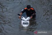 BANJIR MERENDAM JALUR PANTURA SEMARANG. Seoarang warga mendorong motornya yang mogok seusai menerjang banjir yang merendam Jalur Pantura Kaligawe-Genuk, Semarang, Jawa Tengah, Sabtu (31/12/2021). Sejumlah titik ruas jalur tersebut dari arah Kota Semarang ke arah Kabupaten Demak maupun sebaliknya hingga Sabtu (31/12) pukul 19:30 WIB terendam banjir dengan ketinggian bervariasi antara 30 - 80 cm akibat intensitas hujan tinggi sejak Sabtu (31/12) dini hari. ANTARA FOTO/Aji Styawan/aww.