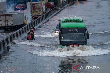 Sebuah bus menembus banjir yang merendam Jalur Pantura Kaligawe-Genuk, Semarang, Jawa Tengah, Sabtu (31/12/2021). Sejumlah titik ruas jalur tersebut dari arah Kota Semarang ke arah Kabupaten Demak maupun sebaliknya hingga Sabtu (31/12) pukul 19:30 WIB terendam banjir dengan ketinggian bervariasi antara 30 - 80 cm akibat intensitas hujan tinggi sejak Sabtu (31/12) dini hari. ANTARA FOTO/Aji Styawan/aww.