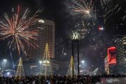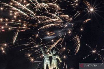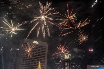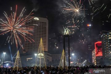 Suasana pesta kembang api saat momen tahun baru 2023 di kawasan Bundaran HI, Jakarta, Senin (1/1/2023). Pemprov DKI Jakarta menggelar "car free night" hingga 1 Januari 2023 pukul 02.00 WIB dalam rangka menyambut tahun baru 2023. ANTARA FOTO/Aprillio Akbar/foc.