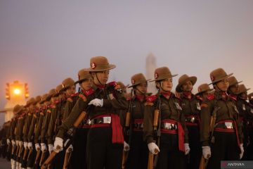 Tentara wanita India ikut ambil bagian dalam latihan parade Hari Republik pada pagi musim dingin yang dingin, di New Delhi, India, Jumat (6/1/2023). ANTARA FOTO/Reuters-Adnan Abidi/hp.