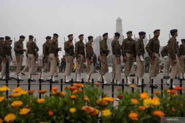 Polisi wanita India ikut ambil bagian dalam latihan parade Hari Republik pada pagi musim dingin yang dingin, di New Delhi, India, Jumat (6/1/2023). ANTARA FOTO/Reuters-Adnan Abidi/hp.