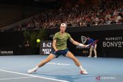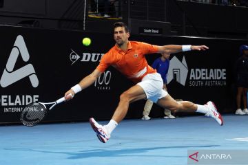 Petenis Serbia Novak Djokovic mengembalikan bola ke arah lawannya petenis Kanada Denis Shapovalov dalam laga babak perempat final Turnamen Tenis Adelaide International, di Memorial Drive Tennis Club, Adelaide, Australia, Jumat (6/1/2023). Djokovic melaju ke babak semi final setelah menang straight set atas Denis Shapovalov (6-3 dan 6-4). ANTARA FOTO/Reuters-Loren Elliott/hp.