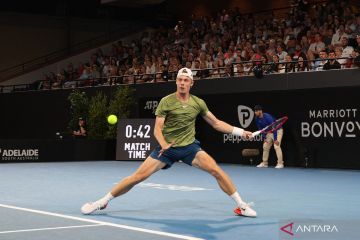 Petenis Kanada Denis Shapovalov mengembalikan bola ke arah lawannya petenis Serbia Novak Djokovic dalam laga babak perempat final Turnamen Tenis Adelaide International, di Memorial Drive Tennis Club, Adelaide, Australia, Jumat (6/1/2023). Djokovic melaju ke babak semi final setelah menang straight set atas Denis Shapovalov (6-3 dan 6-4). ANTARA FOTO/Reuters-Loren Elliott/hp.