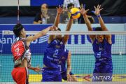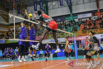 Dua pebola voli putra putra Kudus Sukun Badak Aji Maulana (kiri) dan Syahril Amri (kedua kiri) berusaha menahan smes dari pebola voli putra Surabaya BIN Samator Daouda Yacoubou (tengah) pada pertandingan Seri I putaran pertama Proliga 2023 di SOR Jalak Harupat, Soreang, Kabupaten Bandung, Jawa Barat, Sabtu (7/1/2023). Surabaya BIN Samator mengalahkan Kudus Sukun Badak dengan skor 3-1 (19-25, 25-18, 16-25, 22-25). ANTARA FOTO/Raisan Al Farisi/pras.